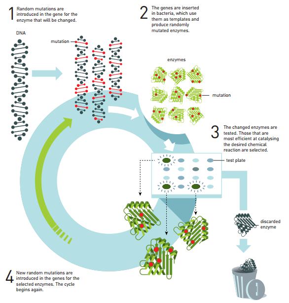 酶定向进化的基本原理。经过几个周期的定向进化之后,一种酶可能会有几千倍的效果。1、随机突变是随机引入基因的,这种酶最终会被改变;2、这些基因被插入细菌之中,细菌将它们作为模板,随机性制造突变酶;3、这种改变的酶物质已被测试,它们在催化所需化学反应方面十分有效。