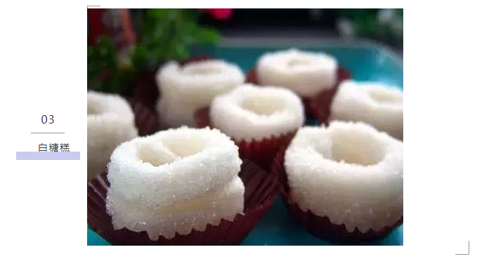 白糖糕是街头小巷必吃的一道美食,这款甜品柔软、洁白,它的表面还沾有江西独特的冻米粉和糖粉混合物,非常受人们喜爱。