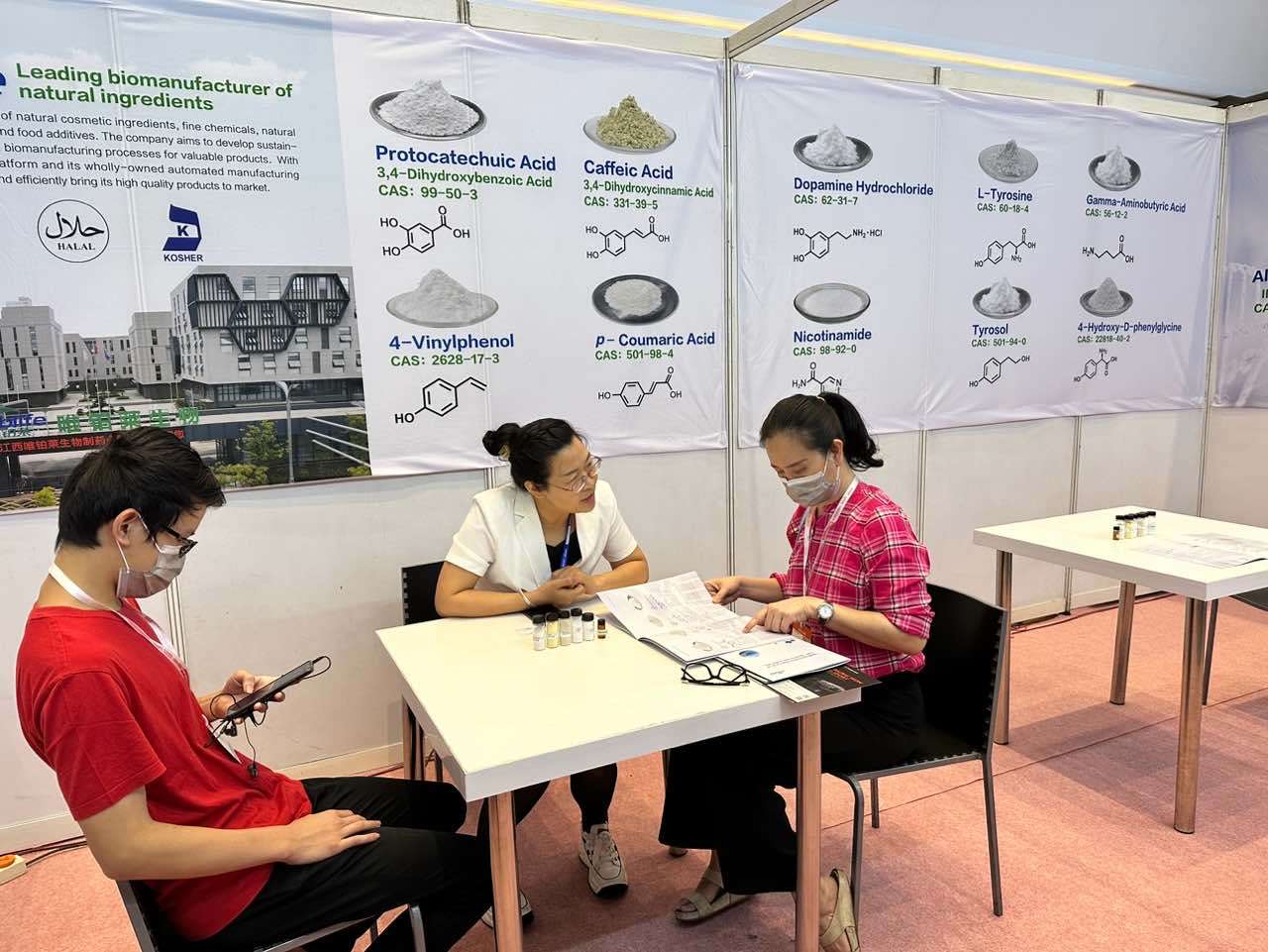 一位印尼知名日化品牌代表,在k1体育官网展位驻足良久,与k1体育官网技术团队深入探讨合成生物原料优势及未来双方合作方向,对k1体育官网在合成生物原料上的技术突破极为赞叹,特别是对新一代烟酰胺、α-熊果苷、红没药醇、神经酰胺等明星产品表现了浓厚的兴趣。